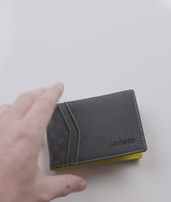 A bold variant of our Daikoku Style wallet in a modern yellow/black colorway, featuring premium Saffino Leather outer with subtle monogram rear print and contrast stitching, along with full grain competition yellow leather inner.
