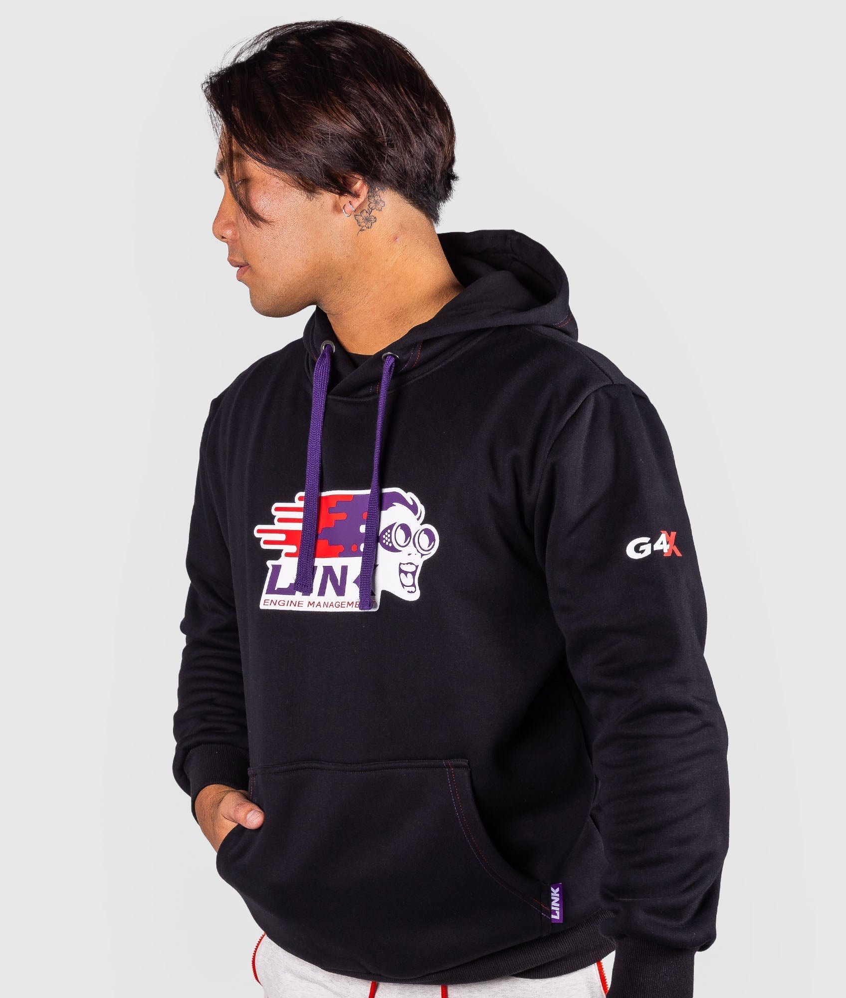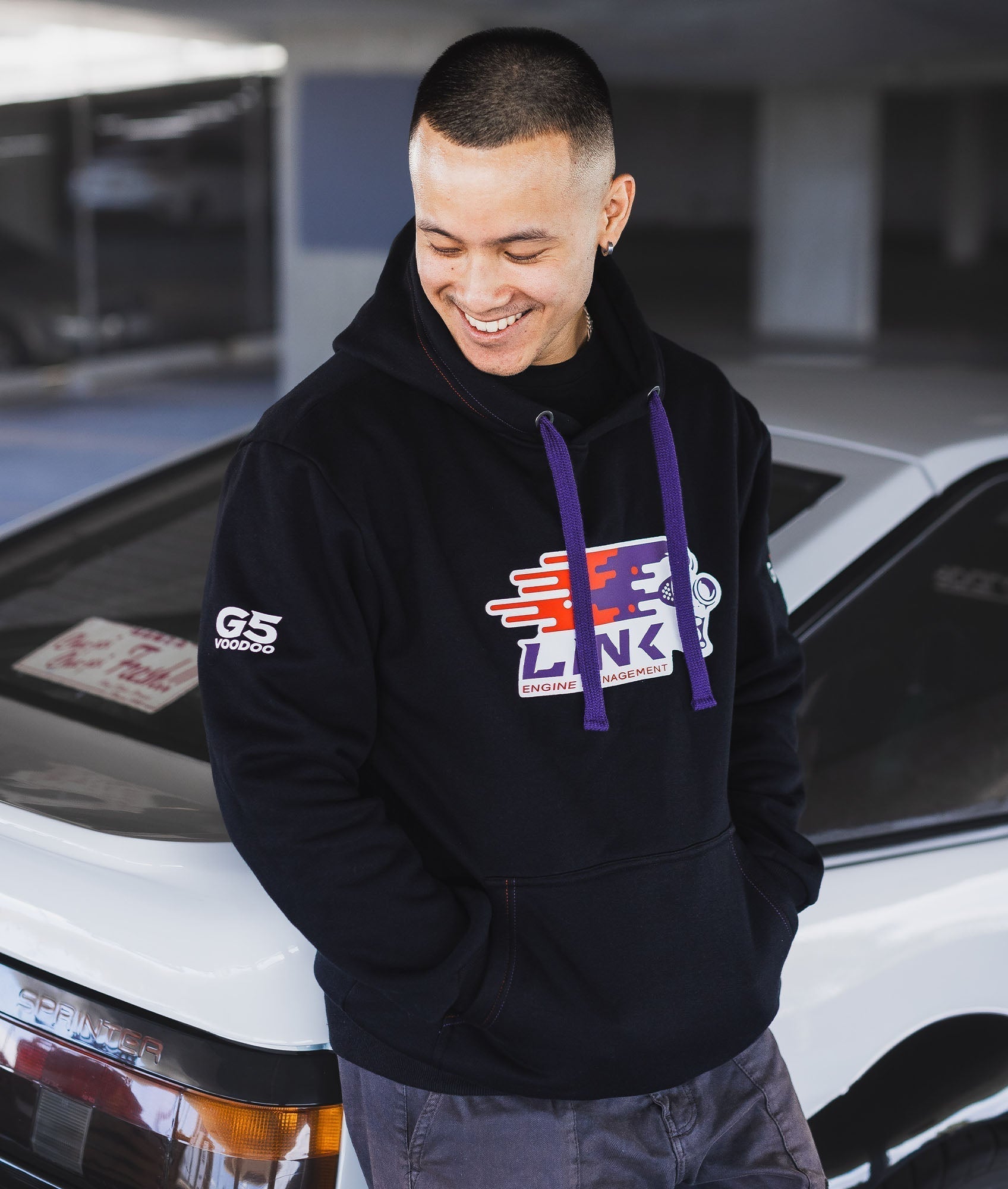 This hoodie features a bold Link logo on the front and their "Exhilaration starts here" slogan on the back, custom-colored drawstrings, and tags all printed on a high quality, tailored hoodie.