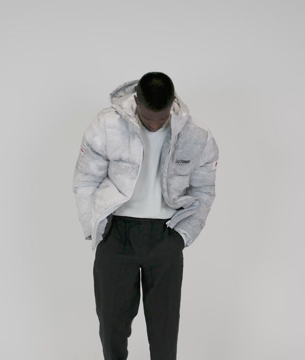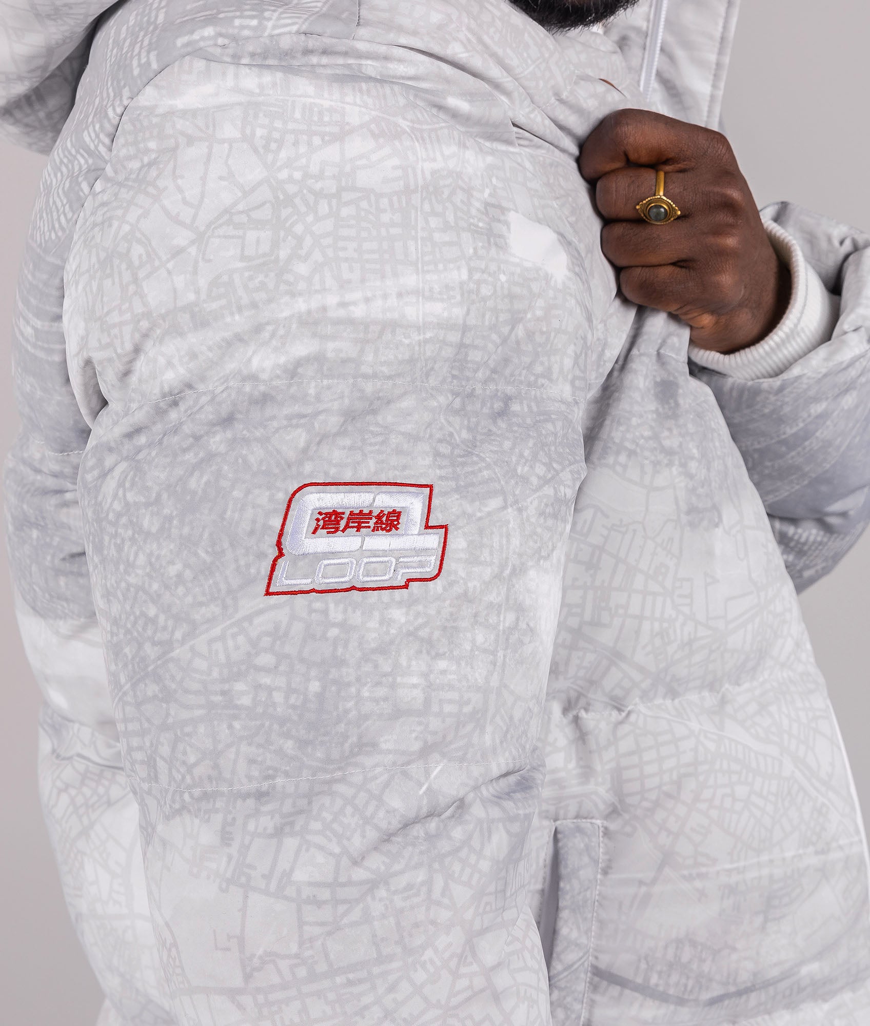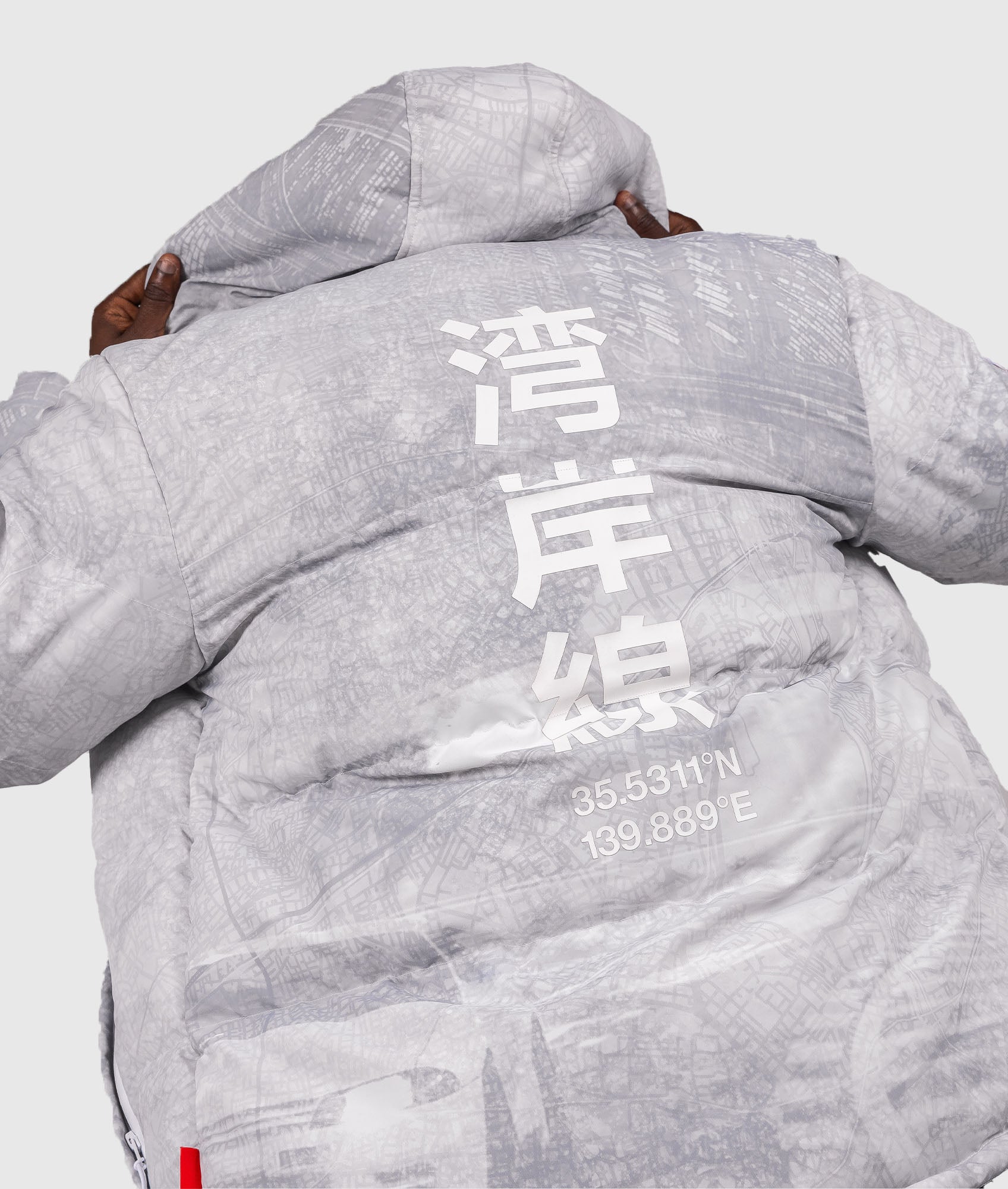 Details like you've never seen in a puffer jacket! The Shuto White Puffer Jacket features a subtle all-over geographical print of Tokyo Bay on the outside with a HUGE reverse print on the inner that highlights the iconic C1 Loop of the Shuto Expressway system in Tokyo.