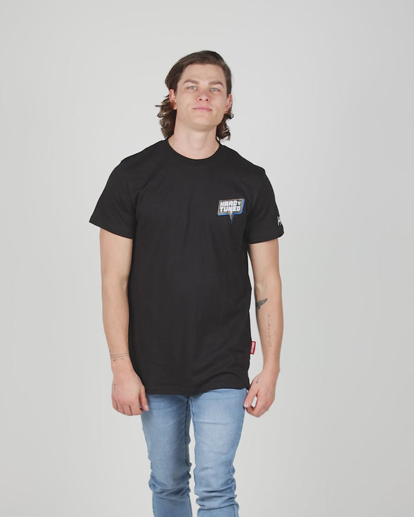 Printed in a bold cell block style with premium plastisol flex inks and laid on a Hardtuned hand-tailored premium combed cotton t-shirt, with 2% elastin for improved fit and comfort.