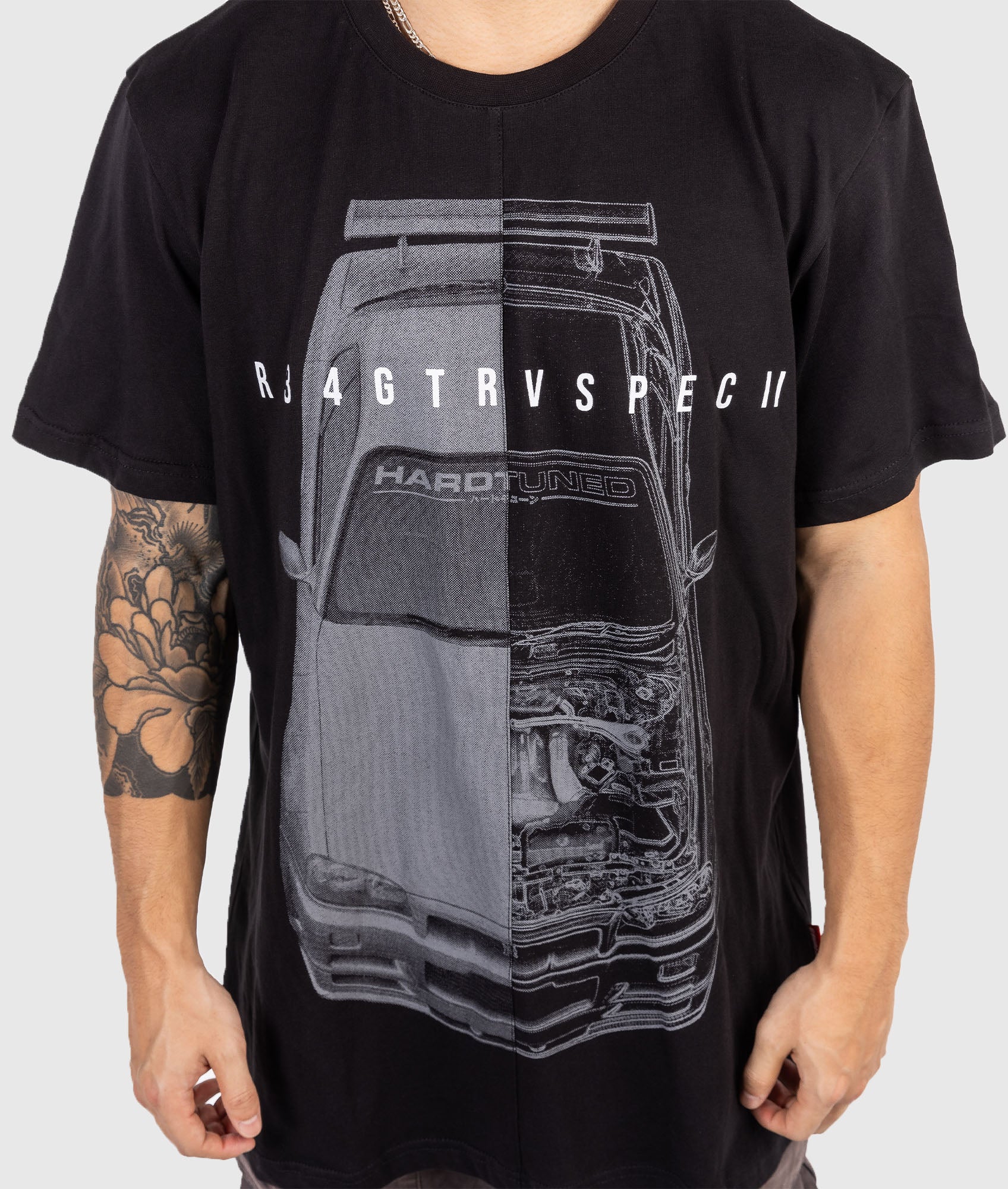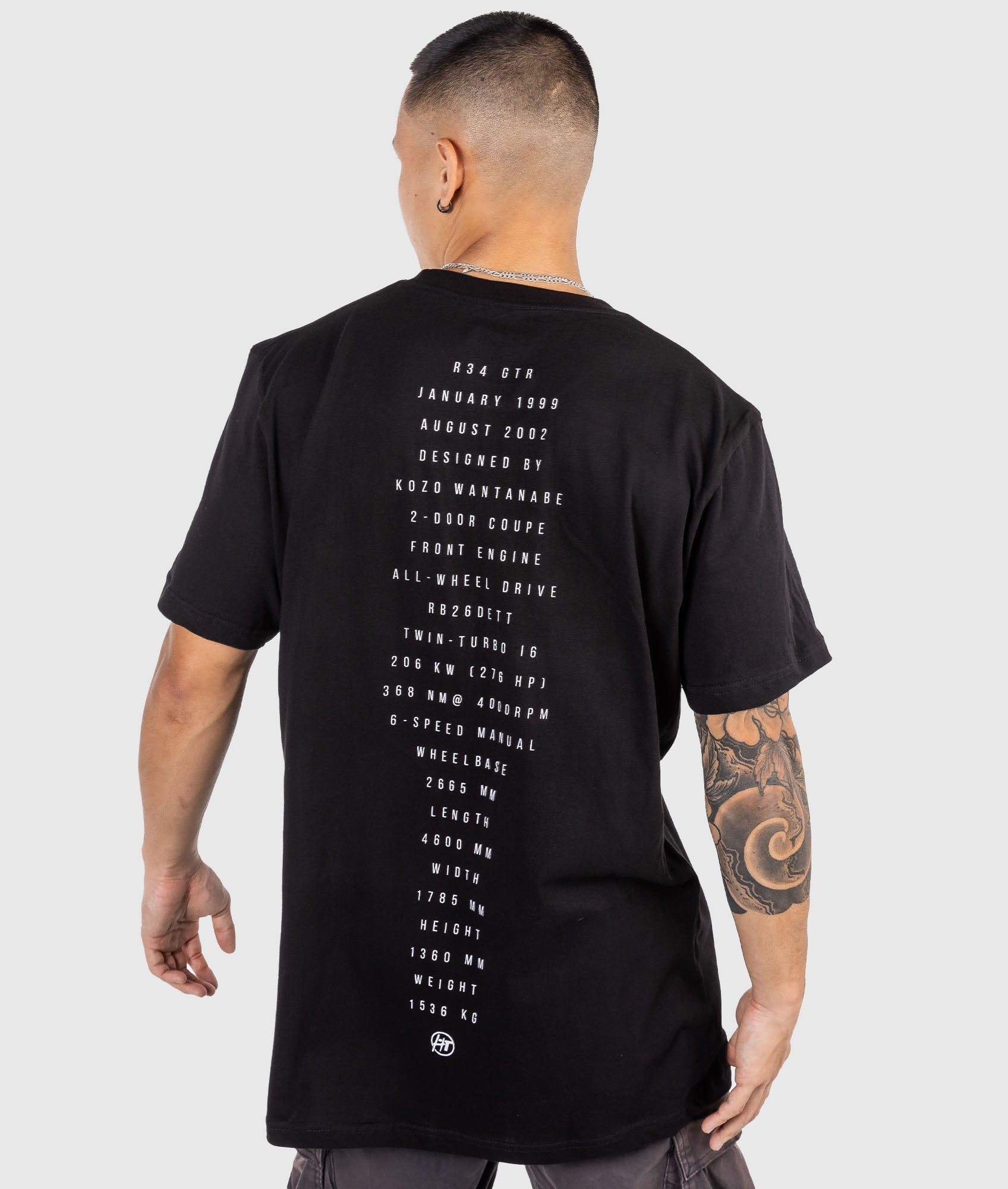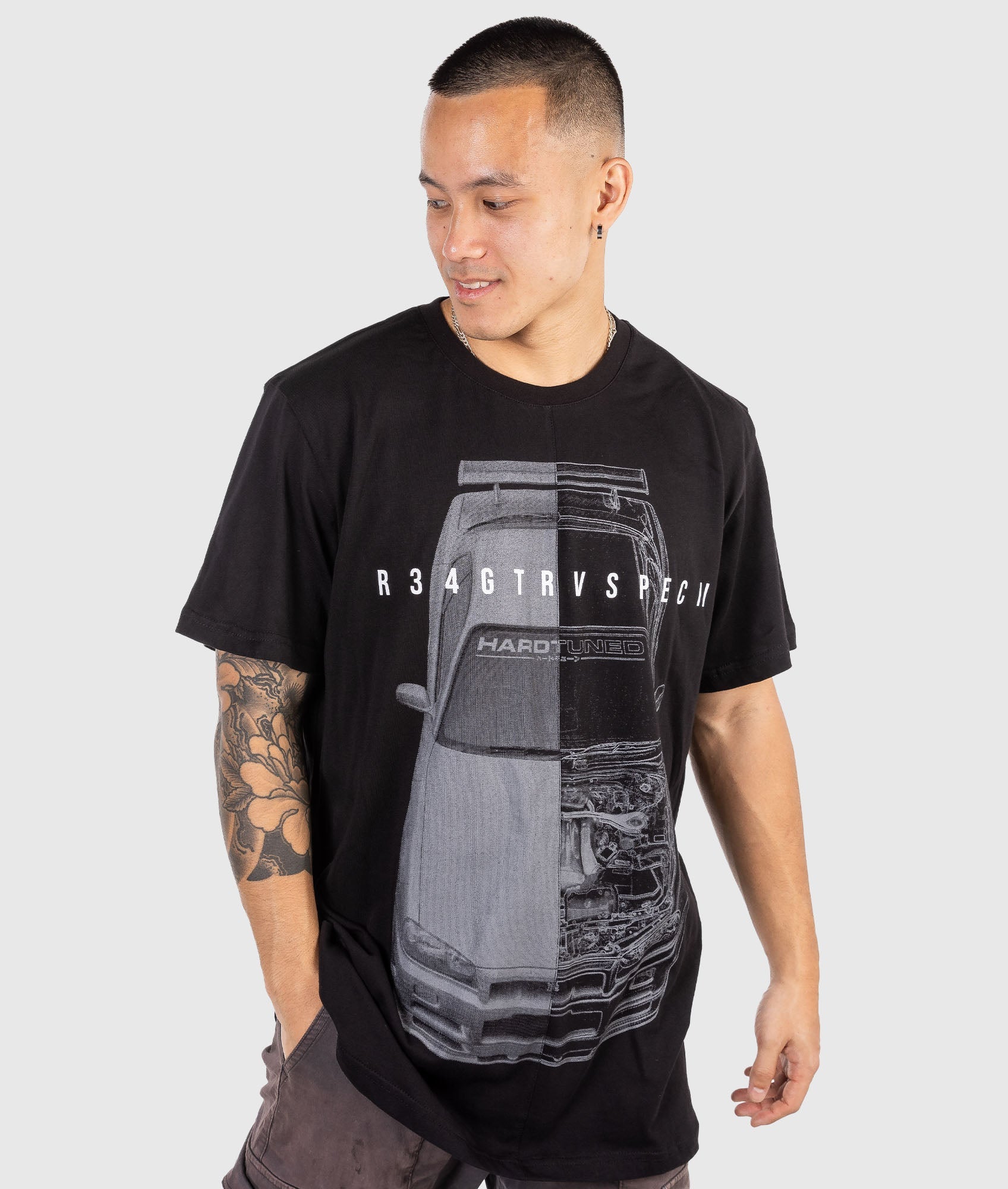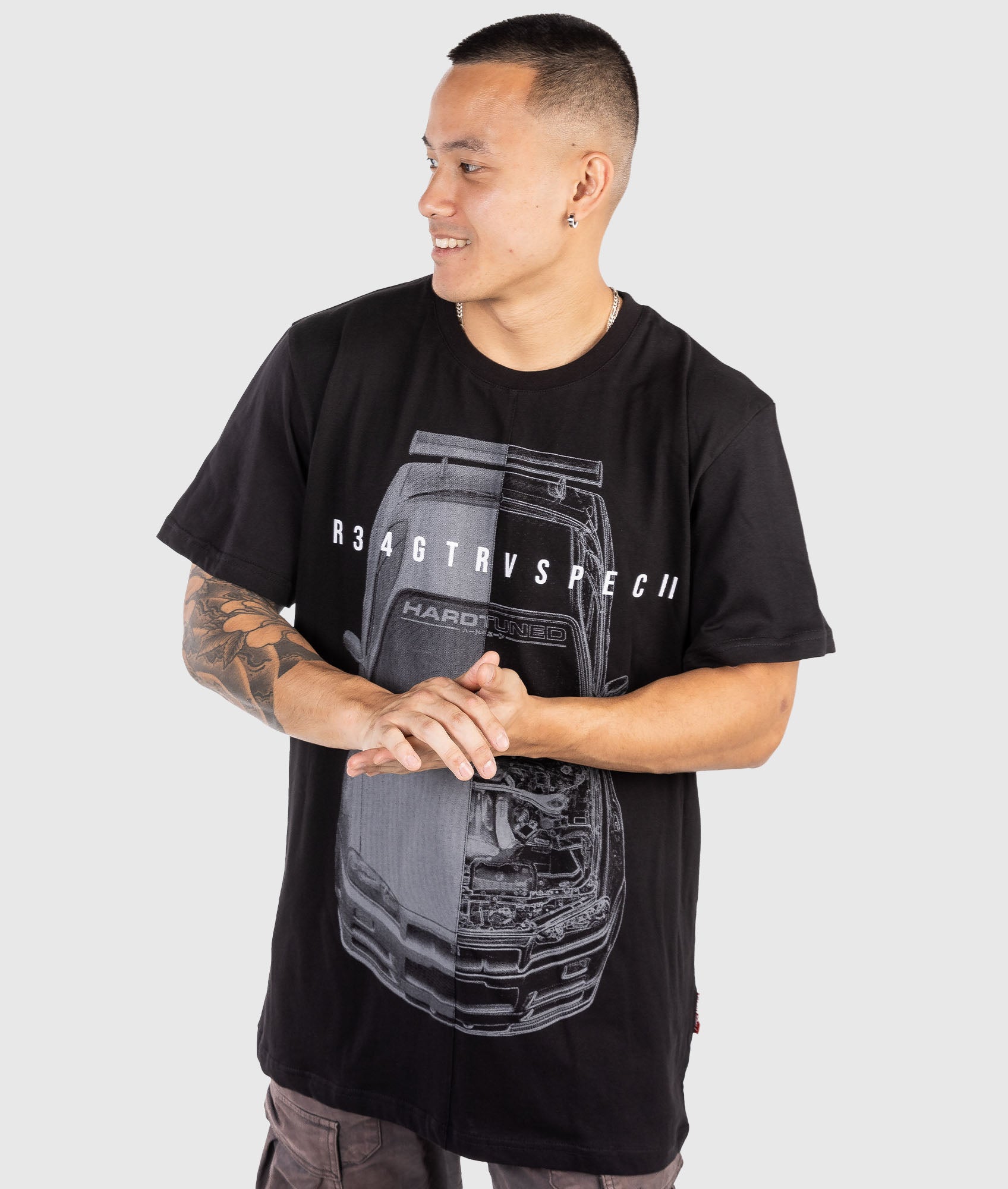 The iconic Nissan GTR R34, the most sought after generation of the GTRs, now on our split tee design. Featuring half photo & half artistic blueprint, each split tee is assembled from two separate prints, sewn together, then reprinted again after assembly to create a unique finish