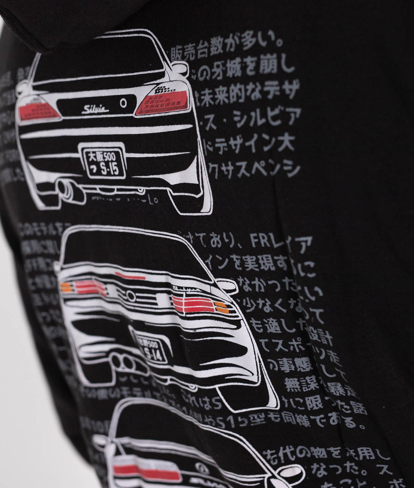 This hoodie is the best way to show off your love for the Silvia with front ends of each model on the front that line up perfectly with the zip and rear ends on the back, it also features extra print on the hood and sleeves for added style.