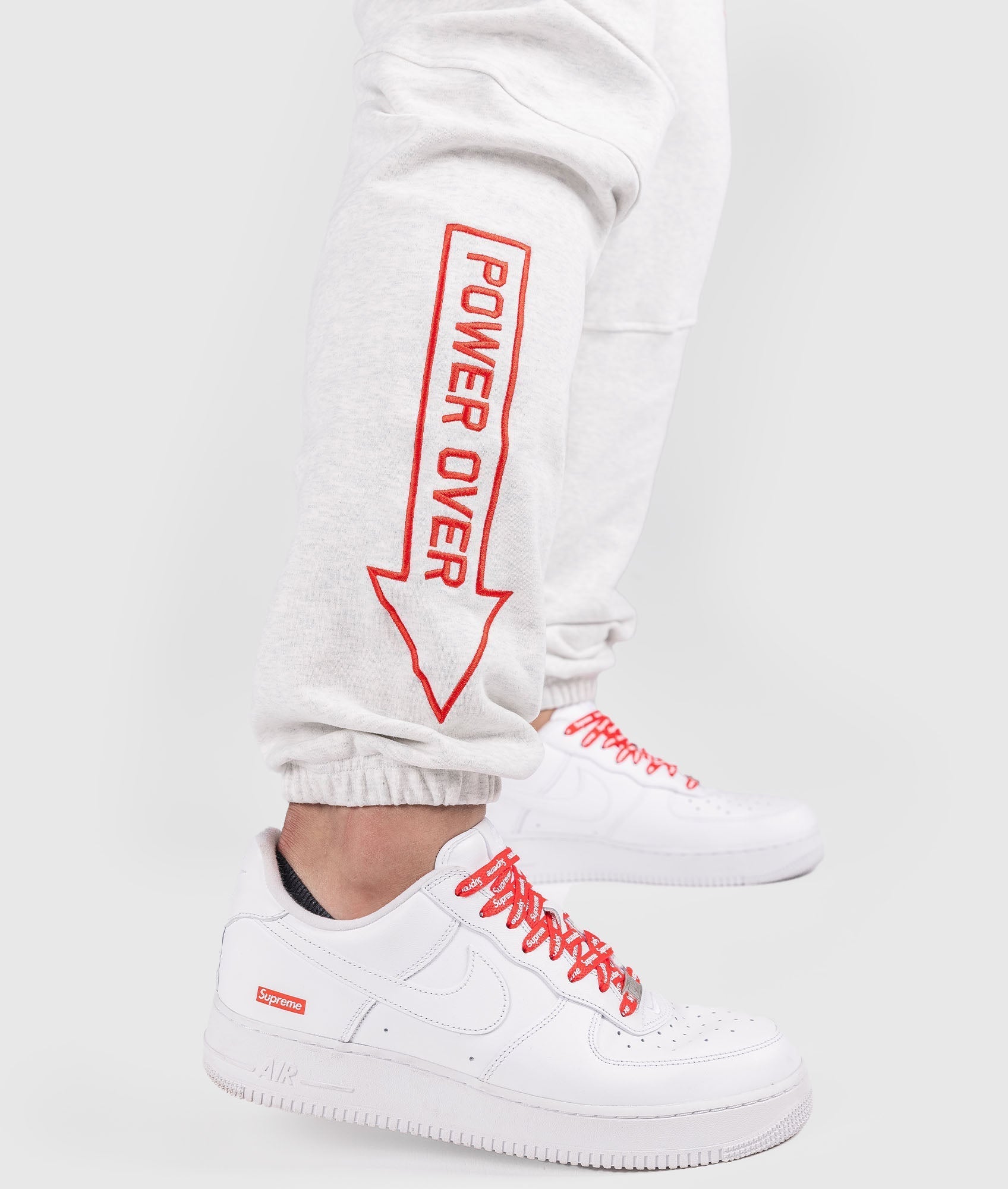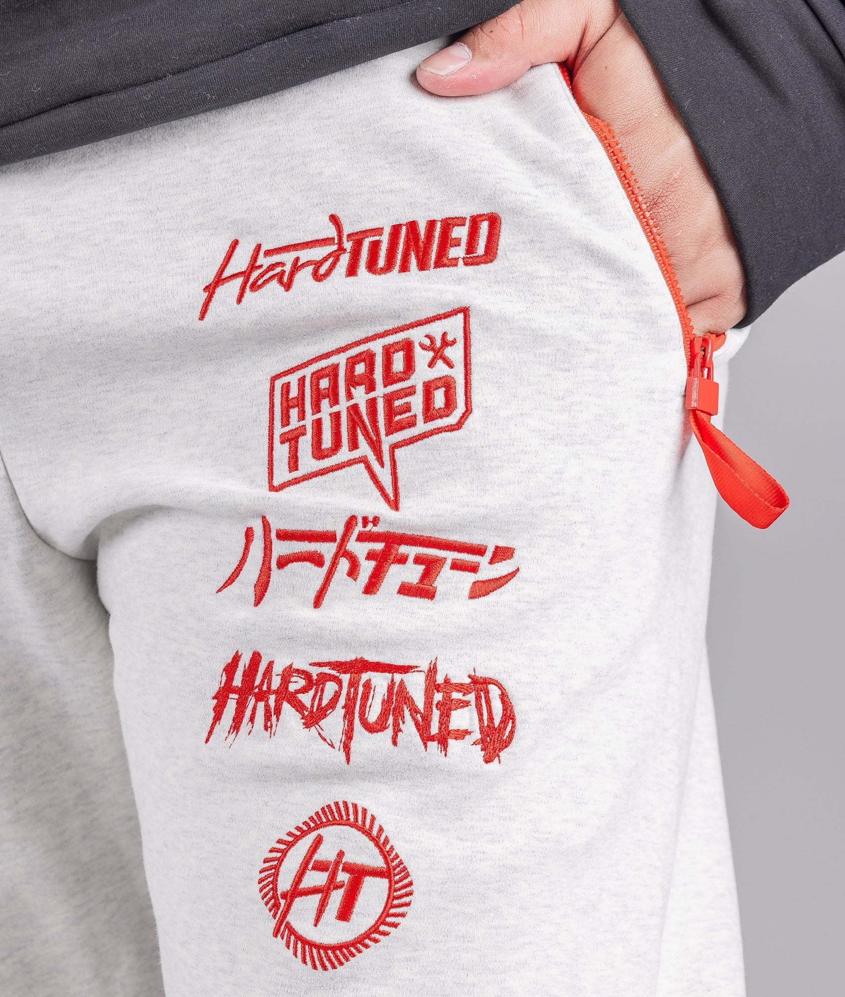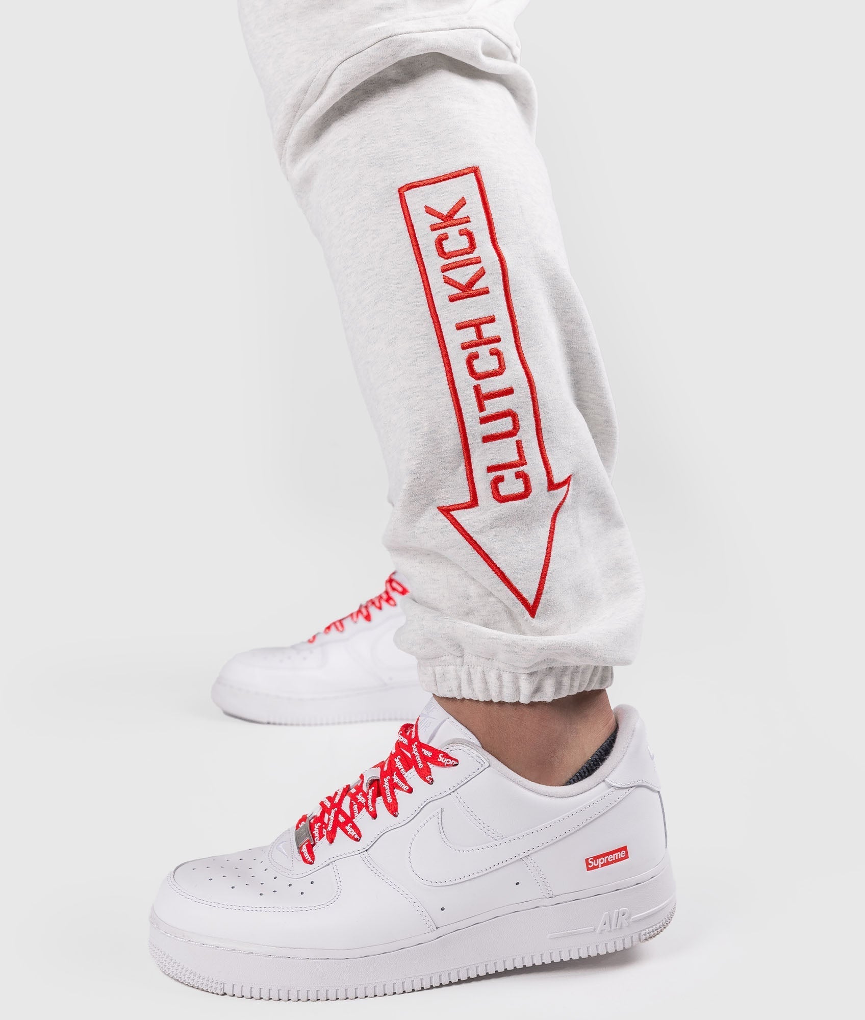 The White Marle Cluch Kick Trackies feature embroidery all over, including bold Hardtuned front logos, and embroided "clutch kick" / "power over" on each leg.