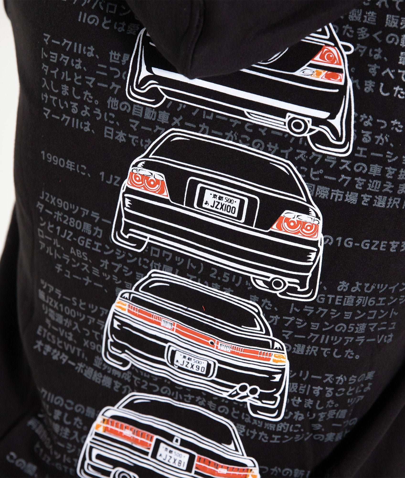 Featuring front and rear ends on the front and back respectively of the JZX81 Mark II, JZX90 Mark II, JZX100 Chaser and JZX110 MKII models, as well as the history of Toyota written in Japanese on the back. Printed on a high quality, tailored hoodie.