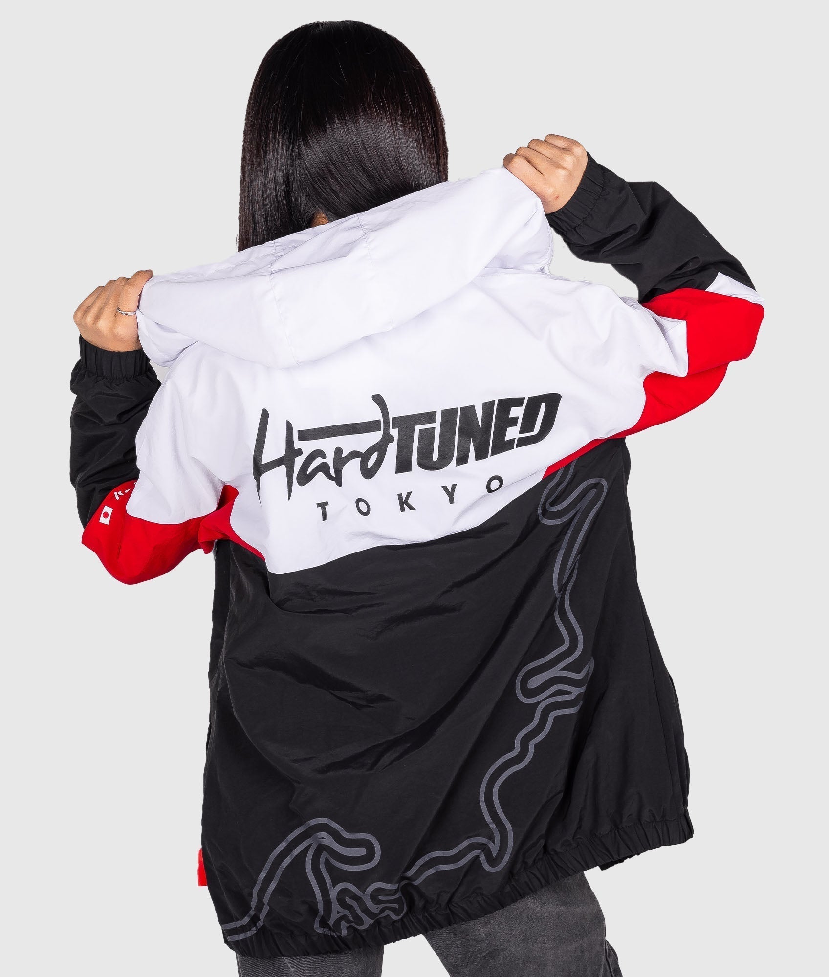 The Tokyo Retro Windbreaker features a bold tri-color print with Togue mountain pass patterning and classic HardTuned Tokyo branding. Details include an adjustable drawstring hood, front zippers comfortable elastic cuffs, and waist hem. This is a mid-weight jacket that will keep you protected from the elements without overheating.